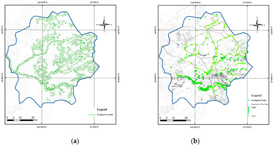 The distribution of ecological corridors and nodes of the study area. (a) The distribution of ecological corridors; (b) the distribution of ecological nodes. Source: Authors.
