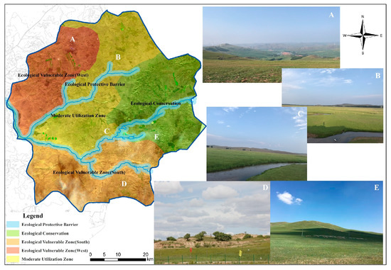 As indicated in Figure 6, we divided Bayinxile into different ecological control zones, including the important ecological conservation zone, the ecological protective barrier zone, the ecological vulnerable zone and the moderate utilization zone, based on both the health assessment result and the distribution of ecological potential information. Among them, the area of vulnerable zone was 1555.67 km2, accounting for 43.74% of total study area, the moderate utilization zone was 1098.33 km2, accounting for 30.88%, and the ecological conservation zone was 902.41 km2, accounting for 25.37%. The ecological vulnerable zone consisted of the western part: high-intensity human activity area, and the southern part: desertification area. The river served as a boundary between vulnerable and functional areas, acting in a decisive role in regional ecological stability and supply. Therefore, the buffer zone around the river was defined as an ecological barrier, which acted like a chain to prevent degradation in current ecological status. The ecological conservation zone was constituted by the ecological service area with the higher vegetation coverage of shrubs and semishrubs.