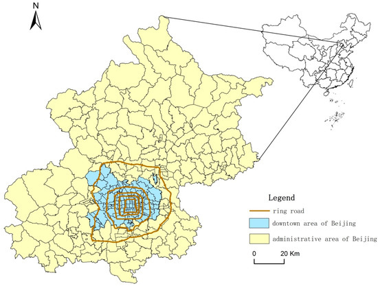 With regard to China, the reformation and opening-up have led to significant transformation in its cities. During the last few decades, unprecedented urbanization has reshaped China’s geography as well as social, economic, and cultural landscape [3,4]. As the capital of China, Beijing has been experiencing rapid urbanization and a burgeoning of its urban commerce, which has resulted in commercial expansion, and thus broken the age-old tradition of urban commercial centers [5]. Furthermore, Beijing is characterized by a long history and profound commercial culture. As a result, Beijing has developed a diverse and multi-layered modern commercial structure. At the same time, the urban population in Beijing has increased rapidly and the distribution of its population is also experiencing great change. Therefore, Beijing is a suitable case study for the analysis of the urban commercial spatial structure and for further analyzing the relationship between the distribution of UCDs and population distribution.