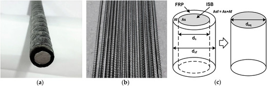 where Esf = elastic modulus of the SFCB, which can be obtained through the mechanical property tests; Asf = cross-sectional area of the SFCB, as shown in Figure 1c; As = cross-sectional area of the ISB; and Af = cross-sectional area of the FRP.