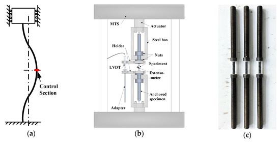 All tests were performed on a mechanical testing and simulation machine (MTS). Due to the low shear capacity of the FRP, the SFCB specimens could not be directly clamped and needed to be anchored with an anchoring tube [28]. To achieve the fixed constraint mechanism (Figure 2a) in the tests, a new set of test instruments was developed (Figure 2b), which consisted of an anchored specimen (Figure 2c), steel boxes, nuts, holders, linear variable differential transformer (LVDT) sensors, etc. The installation procedure is as follows: (1) Anchor the specimen into the anchoring tubes; (2) Install the nuts at the ends of the anchoring tubes near the gauge section; (3) Connect the steel boxes to the MTS fatigue testing machine; (4) Insert the specimen (with the anchoring tubes) into the upper and lower steel boxes; (5) Adjust the position of the actuator to eliminate the spaces between the nuts and steel boxes; (6) Install the other two nuts in the steel boxes to fix the anchoring tubes to the steel boxes; and (7) Install the holders, platform, LVDT sensor, and extensometer sensor. Each part of the test instrument was designed to be extremely rigid to achieve the fixed constraint mechanism. The load and displacement were recorded using the MTS and LVDT sensor, respectively, and the load could be further transformed to the stress with the actual cross-sectional area of each specimen when it was under axial tension or axial compression. An extensimeter (gauge length equal to 25 mm) was set in the middle of the specimen, as shown in Figure 2b, to record the strain when the specimen was under axial tension or axial compression. The initial tensile or compressive modulus of each specimen could be further calculated with the strain, recorded by the extensimeter, and the stress, calculated with the load and the actual cross-sectional area of each specimen. The loading system was designed to test the compressive behavior of the SFCB bars without lateral constraints, and the test results could be applied to the SFCB reinforced concrete structures with a weakened concrete cover that was possibly damaged by long-term corrosion or by a natural hazard such as a minor earthquake.