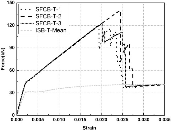 The results of the uniaxial tensile test are provided in Table 2 and Figure 3, where L = length of the specimen; E+ = initial tensile elastic modulus; E2+ = post-yield tensile modulus; rsf+ = post-yield tensile modulus ratio; σsfy+ = tensile yield stress of the SFCB; σsfu+ = ultimate tensile stress of the SFCB; σsy+ = tensile yield stress of the ISB; σsu+ = ultimate tensile stress of the ISB; and ISB-T-Mean refers to the mean value curve of the ISB specimens. The load-strain curves of the uniaxial tensile tests were applied in this paper to facilitate a comparison between the SFCB and ISB specimens, i.e., noting where the SFCB started yielding at the same tensile strain as the ISB and then exhibited a stable post-yield stiffness until the fracture of the FRP. The stable post-yield stiffness, attributed to the elastic fibers of SFCB, is much higher than that of traditional steel bars (commonly equal to 0), which makes the SFCB more beneficial to the seismic performance of concrete structures than traditional steel bars. After the FRP fractured, the tensile loading was primarily provided by the inner steel bar; therefore, the load-strain curves of the SFCB were essentially consistent with those of the ISB.