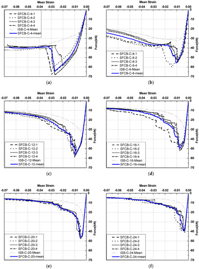 The results of the uniaxial compressive tests are provided in Table 3 and Figure 4, where E− = initial compressive elastic modulus; E2− = compressive post-yield modulus; rsf − = compressive post-yield modulus ratio; Fsfy− = compressive yield load of the SFCB; σsfy− = compressive yield stress of the SFCB; Fsfu− = ultimate compressive load of the SFCB; σsfu− = ultimate compressive stress of the SFCB; Fsu− = ultimate compressive load of the ISB; σsu− = ultimate compressive stress of the ISB; SFCB-C-4-1 indicates the first SFCB specimen (λeq = 4) under uniaxial compressive loading; ISB-C-8-2 indicates the second ISB specimen (length is equal to that of SFCB-C-8-2) under uniaxial compressive loading; ISB-C-4-mean indicates the mean value curve of four ISB specimens (length is equal to that of SFCB-C-4) under uniaxial compressive loading, as shown in Figure 4a. The average strain in Figure 4 refers to the macroscopic compressive mean strain, which equaled the displacement obtained by the LVDT sensor, as shown in Figure 2b, divided by the length of each specimen.
