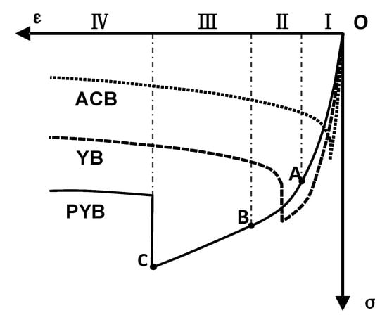 I: Axial compression stage. At the beginning of compression, all specimen cross-sections were under axial compression, and the load-strain curve rose rapidly. With an increase in the strain, a lateral deformation occurred at the control section. Then, the stress condition of the control section gradually transformed from axial compression to eccentric compression, which resulted in a slight decrease in the compressive stiffness (the slope of the load-strain curve) (‘OA’ in Figure 5).