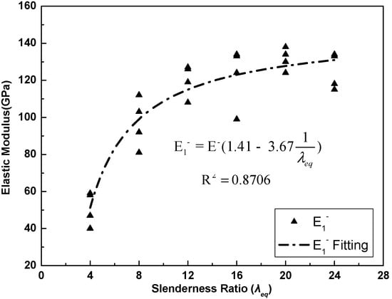 The stress state of the anchored specimen under initial compression is similar to the stress state of an unbonded reinforcement in a structure; this reinforcement is typically applied in seismic design to achieve a better seismic performance, especially for the SFCB. Due to the effects of the non-uniform stress distribution condition on the anchored specimens (explained in the Test Results Section), the actual compressive modulus was smaller than the initial compressive elastic modulus, especially when the slenderness ratio was relatively low. Therefore, a nominal initial compressive elastic modulus (E1−), which is the ratio of the measured slope of the load-strain curve in the elastic compression stage to the cross-sectional area of the specimen, was proposed to present the characteristics of the elastic compression stage. The results are presented in Figure 7. Using statistical analysis and fitting, the equation for the nominal initial compressive elastic modulus can be presented as Equation (8) as follows: