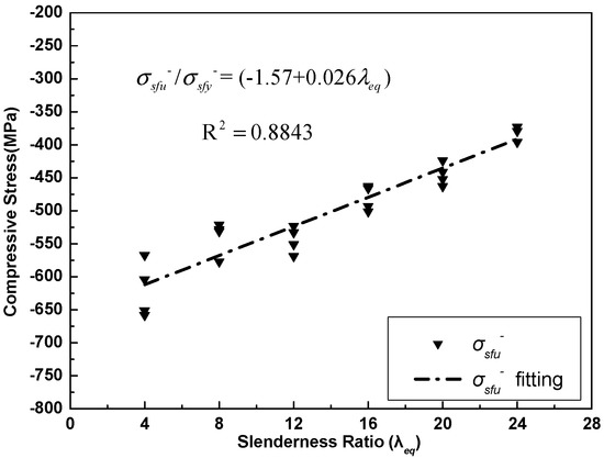 An improvement of approximately 30% was observed when comparing the ultimate compressive stress of the SFCB to the corresponding ultimate compressive stress of the ISB when the slenderness ratio of the SFCB exceeded 8 (Table 3). Additionally, the ultimate compressive stress of the SFCB was inversely proportional to the slenderness ratio, which was similar to the characteristics of the steel bar when under compression [4], and a linear relationship between the ultimate compressive stress of the SFCB, and the slenderness ratio was captured using statistical analysis (Figure 8). The equation of the ultimate compressive stress of the SFCB can be presented in Equation (11) as follows: