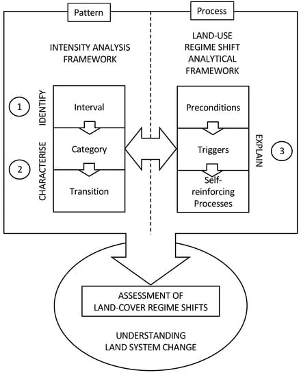 Conceptual diagram of the systematic process for investigating land-cover regime shifts using combined analytical frameworks.