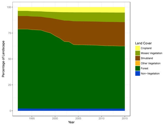 The main spatial data source for this investigation was the 24-year annual time-series global land cover product (1992–2015) developed by the European Space Agency Climate Change Initiative (ESA CCI; []). These globally consistent land cover maps, delivered at 300-m spatial resolution, were interpreted from a suite of satellite data acquired by various sensors (i.e., MERIS, SPOT-VGT, AVHRR, PROBA-V) using the standardised hierarchical Land Cover Classification System developed by the Food and Agriculture Organisation of the United Nations []. We used these land cover maps to quantify annual land cover transitions as a follow-up to a previous study that evaluated land cover change across two time-points between 1995 and 2015 [], with the initial intention of (1) quantifying annual dynamics of land cover transitions, and (2) generating input data for a predictive land cover change model. However, after discovering a land-cover regime shift (see Section 4, Results), the objectives of this study shifted towards the investigation of landscape-level land-cover regime shifts.