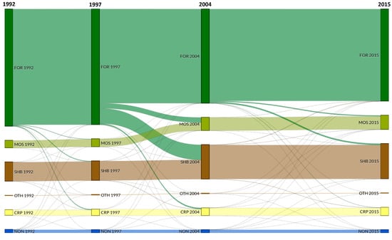 Gross land cover transitions during the periods of stable land-cover regimes (1992–1997 and 2004–2015) and the land-cover regime shift (1997–2004). Land cover categories include: FOR, Forest; MOS, Mosaic Vegetation; SHB, Shrubland; OTH, Other Vegetation; CRP, Cropland; NON, Non-Vegetation.