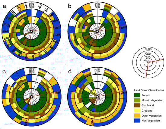 Category-level Intensity Analysis. Summary of trends of the gross losses and gross gains among land cover categories within (a) Tanintharyi Region; (b) Dawei District; (c) Myeik District; and (d) Kawthoung District during the three periods, namely pre-regime shift (1992–1997), during the regime shift (1997–2004), and post-regime shift (2004–2015). Trends are denoted as concentric circles starting from the inner circle outwards, namely: AL/AG, actively losing and actively gaining; AL/DG, actively losing and dormantly gaining; DL/AG, dormantly losing and actively gaining; DL/DG, dormantly losing and dormantly gaining. “Active” or “dormant” refer to gross gains or losses that are greater or less than, respectively, the uniform intensity across all categories for that interval. Each circle sector represents one annual time interval and progresses clockwise from 1992 to 2015. Red lines comprising several circle sectors (annual intervals) indicate the period of the regime shift.