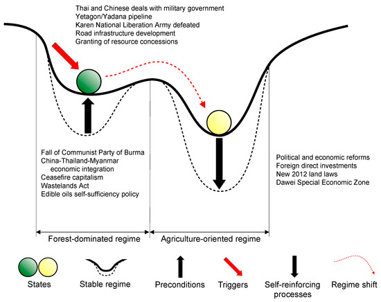 Land-cover regime shift in Tanintharyi Region, Myanmar depicted as a ball-and-valley diagram (adopted from Müller et al. []). Balls represent the state of land systems. Upward-pointing arrow indicates enabling preconditions; red arrow indicates the trigger events that punctuate the stable equilibrium of the former forest-dominated regime resulting in a shift to a new agriculture-oriented regime. Downward-pointing arrow indicates self-reinforcing processes.