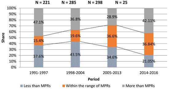 First, the proportion of samples violating the MPRs notably decreases. As mentioned above, the violating sample is defined as that with an actual parking supply less than the MPR (Figure 2). This proportion among office projects built after 2014 is a mere 21.05%, whereas it is as high as 37.6% among those built between 1991 and 1997. Given that the MPRs were adjusted to a broader spectrum, the proportion of samples with an actual parking supply within the MPRs gradually increased from 15.4% between 1991 and 1997 to 36.8% between 2014 and 2016. On the one hand, this better performance shows improved management. On the other hand, it may also show the willingness of developers to provide more parking. In the face of continuously tightening parking standards and an increasing demand for parking, nearly half (42.1%) of the new projects (after 2014) have more actual parking spaces than the MPRs.