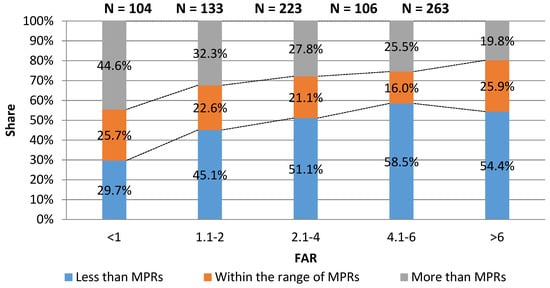 Second, the effects of MPRs on parking provisions change with the development intensity. With the increase in the FAR, the samples with fewer parking provisions than MPRs increase, whereas those with more parking than MPRs notably decrease (Figure 3). As shown in Figure 3, in the case of 44.6% of developers, the number of parking spaces provided is more than the MPRs when the FAR is below 1.0, while this proportion is only 19.8% among projects with a FAR over 6. In contrast, more than half of developers violate the MPRs, with fewer parking spaces than required, once the FAR is over 2. When the FAR is below 1, only 29.7% of developers offered less parking than the MPRs. The cost concerns of property explain this phenomenon. When the FAR grows higher, the construction cost of parking spaces increases because less ground space can be used for parking, and parking spaces should be provided in the form of underground parking (the construction cost is approximately RMB 2000 per square meter for the first layer of underground parking. The cost increases by RMB 1500–2000 for each additional layer.).