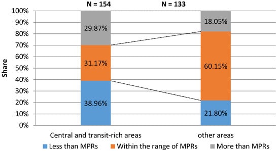 Third, the changes in developers’ willingness in regards to parking provision via transit accessibility are ambiguous. Between 2004 and 2013, general offices in central and transit-rich areas had lower MPRs of 0.3–0.5 space/100 m2, compared to those in other areas where the MPRs were 0.3–1.0 space/100 m2. This analysis extracts a subset that contains 287 general offices constructed during the application of the third UPSG. Only 31.17% of office projects in central and transit-rich areas provided parking provisions within the range of the MPRs, while this proportion is more than 60% for projects located in other areas (Figure 4). This result is largely due to the smaller spectrum of MPRs applied in the former. Given the lower MPRs in central and transit-rich areas, 29.87% of developers opt to provide more parking than the requirements. This proportion is only 18.05% in other areas, where the upper limit of MPRs is set to 1.0 space/100 m2. Inexplicably, however, there is a relatively large percentage (38.96%) of developers who offer less parking than the MPRs in central and transit-rich areas. One possible explanation is that the denser developments in those areas depress the willingness of developers to prioritize parking provisions because of cost concerns.