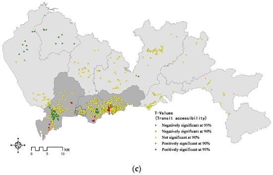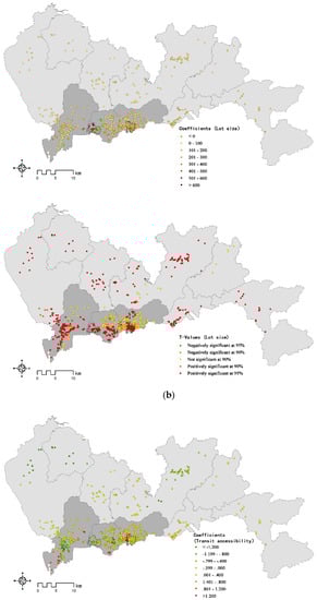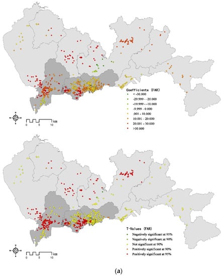 As the t-value statistics and maps in Table 4 and Figure 5 show, the significance level of each independent variable varies over space. In certain areas, an independent variable may have significant relationships with parking provision; however, the relationships in other areas are not significant. To better understand the spatial non-stationarity of the relationships, Table 4 summarizes the percentage of coefficients that are negatively or positively significant at the 90% and 95% level, respectively, and the percentage of coefficients that are not significant. The effect of important explanatory variables on parking provision can be spatially investigated, as shown in Figure 5 and Figure 6.