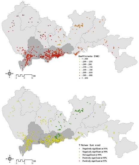 The two built environment variables, the FAR and lot size, have stronger explanatory power for parking provision. The FAR is significantly and positively related to absolute parking provision in most office samples (approximately 60%). This outcome is consistent with our OLS model, and is in line with the MPRs implemented in Shenzhen. The MPRs stipulate the minimum number of parking spaces per 100 m2 of floor area for new office developments. With the increase in development intensity, the number of parking spaces provided by developers must increase as well. The significant positive correlations that existed between the FAR and the number of parking spaces were primarily distributed in the core area of the Futian and Nanshan districts, and in most suburban areas. As shown in Figure 6, the estimated coefficients for suburban developments were generally higher than those for developments in the central area. This result indicates that a one-unit increase in the FAR leads to a greater increase in parking spaces in suburban areas than in central areas. We may infer that developers have a strong provisional willingness to provide parking spaces when the projects are located in suburban areas because the land cost is relatively low. The relationships between the FAR and the number of parking spaces are not significant in the core area of Luohu district, and parts of the Nanshan and Futian districts. We speculate that the reason for this is that the construction of these areas occurred earlier (prior to 2000), and that the development intensity was generally low and relatively homogeneous.