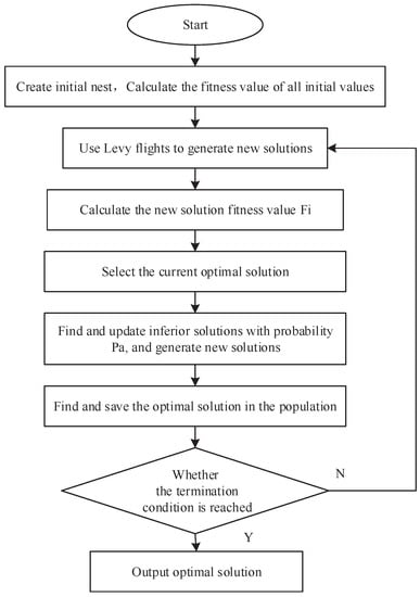 Step 3. Update the population, Then, the fitness value of the optimal bird’s nest position obtained from in (2) is compared with the optimal value . If the value is less than , update and simultaneously, if the value is not less than , then do not update and . After that, if the stop condition is satisfied, the global optimal value and the corresponding global optimal position are output, and if the stop condition is not reached, the iteration is continued.