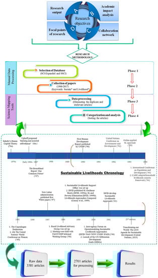 To chart the development in the SL field, this research chose the SCIE and SSCI databases from the Web of Science Core Collection, because they are relatively representative and authoritative index databases that are available. Both SCIE and SSCI cover a large number of high-quality journals of the social sciences from different countries and regions, and are clearly important databases in the social sciences [39]. In order to search for the terms “sustainable” and “livelihoods” together, this paper adopted the two-term search string ‘sustain* (which yields, for instance, “sustaining”, “sustained”, “sustainable,” and “sustainability”) and livelihood * (yielding “livelihood” and “livelihoods”). As noted above, this research focused on papers published in the period beginning in 1991, because there is little SL data prior to that year. It reports literature up to March 8, 2018 in this paper. In total, 3581 raw-data items were recorded based on a topic search of the terms “sustain *” and “livelihood *” in titles, abstracts, and indexing terms.
