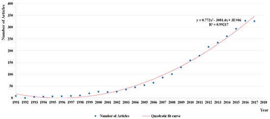 As noted above, the final dataset for analysis consisted of 2701 papers on the topic of SL taken from the SCIE and SSCI databases. Trend analysis reveals striking features. Figure 2 shows that there was a dramatic increase in the number of published papers on the topic of SL globally, from 8 in 1991 to 325 in 2017. It is noticeable that there was a period of slow growth of publication output from 1991 to 1999, and rapid growth thereafter, although with a slight drop most recently. The number of SL-related publications reached a peak in 2016, with 327 papers included in SCIE and SSCI databases. This makes it interesting to consider what may happen in this field in the coming years.