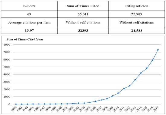 Citations are an effective way to measure the academic impact of papers, and also to show changes in the literature in intelligible ways over time. According to the WOS Core Collection, SL showed a substantial growth of citation impact in recent years, with 35,311 citations up to our retrieval date (8th March 2018). The average number of citations per published item is 13.07. The average number of citations per year of all published papers is 1307.8 (see Figure 3). In addition, the SL literature has 16 ESI highly cited papers (ESI highly cited paper means one whose number-of-times cited ranks in the top 1% in the world in the same subject and same publication year.) among the 2701 papers we studied. The numerously cited papers and ESI highly cited papers are important indicators of academic achievements on the subject of sustainable livelihoods.