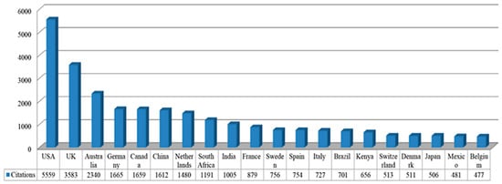 Academic influence can be observed by citation. The cited articles come from more than 202 countries, including USA, UK, Australia, Germany, Canada, China, Netherlands, South Africa, and India, demonstrating that SL research is active in the global academic community. As shown in Figure 4, in all citing articles (24,588, excluding self-citations), the largest two in percentage terms are the USA and UK, which contributed 22.61% (5559) and 14.57% (3583), respectively.