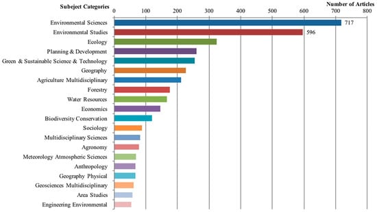 Each article indexed by the data source (Web of Science) is assigned one or more subject categories. Figure 5 shows a graph of such subject categories based on the classification of subject categories in the Web of Science Core Collection. The publication output for SL research is distributed in 121 subject categories. The most active category is Environment Sciences (717 scientific papers), followed by Environment Studies (596 scientific papers). Approximately 48.6% of total SL publication output is assigned to these two subject categories. Other active subjects include Ecology, Planning & Development, Green & Sustainable Science & Technology, Geography, Agriculture Multidisciplinary, Forestry, Water Resources, Economics, and Biodiversity Conservation. Figure 5 shows the top 20 active subjects of SL publication output, showing that SL research has been developing in a variety of categories.