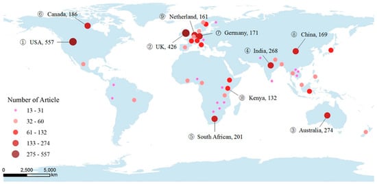 The contributions made by different countries are estimated using the location of the affiliated institution of at least one author of each published article. The SL topic covers 138 countries. Figure 6 shows the top 50 most-active countries, with the top 10 being named. The sizes and colors of dots indicate the relative ranking of the countries. The country contribution analysis reveals that the top 20 most-active countries account for 85.6% of all publication output (2701 papers). USA, UK, and Australia have the highest publication output, with 557 papers (20.62% of the total), 426 papers (15.77%), and 274 papers (10.14%), respectively; followed by South Africa (201 papers), Canada (186 papers), Germany (171 papers), China (169 papers), Netherlands (161 papers), and Kenya (132 papers). The seven major industrial countries (“Group of Seven”: Canada, Italy, France, Germany, UK, Japan, and US) were all included in the top 20 in publication output.