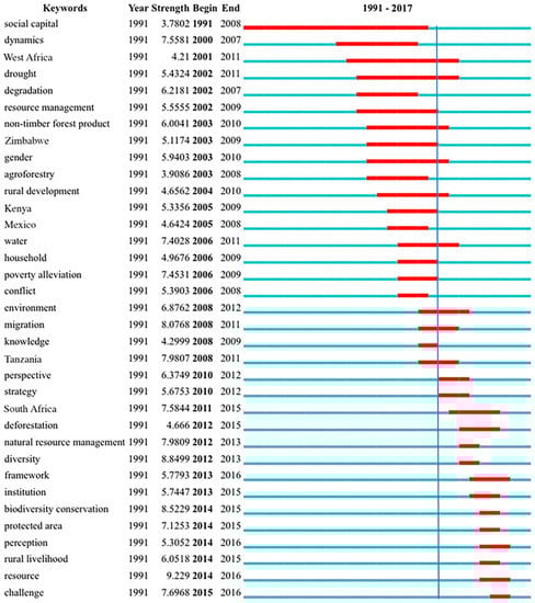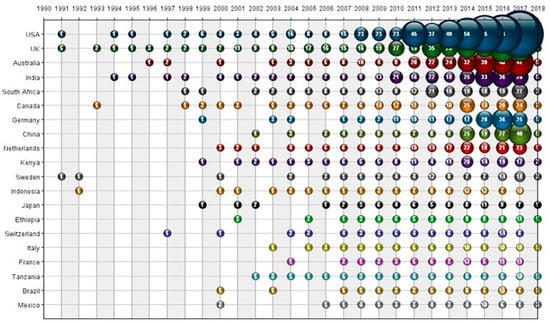 Figure 7 offers a visual presentation of the publication output of the top 20 countries since 1991. The figure makes clear that three developed countries (USA, UK, and Australia) have consistently taken the leading positions in this research field. It is noticeable that the publication outputs of India, Germany, China, and Netherlands have increased rapidly since 2013. Following the first United Nations Conference on Environment and Development (UNEP) in 1990, researchers around the world published papers in the following year on the issue of environmental management and sustainability. For example, one concerned rapid resource transformation caused by increased population and having a serious impact on the sustainability of natural assets and ecological processes in tropical countries [64]. There were also five significant papers published by authors at British institutions in that year. One highlighted the significant contributions made by women in environmental management [65]. Another argued that sustainable livelihoods are important for people in marginal and fragile rural environment in the 21st century [66]. A third analyzed the difficulties and significance for Mongolia to manage its economic transition while protecting its valuable achievements in regard to social welfare [67]. Another took a human-focused approach to broadly-based concepts of sustainable development [68]; and a fifth discussed the significant role of wet areas in drylands, which play a role in sustaining rural livelihoods and increasing food security [69]. Authors from Sweden and Indonesia highlighted three interrelated dimensions of security: livelihood security, environmental security, and international security [50,69]. Around this time, researchers began to place much greater stress on the need to understand the SL concept, and also to recognize serious ecological issues in earlier research.