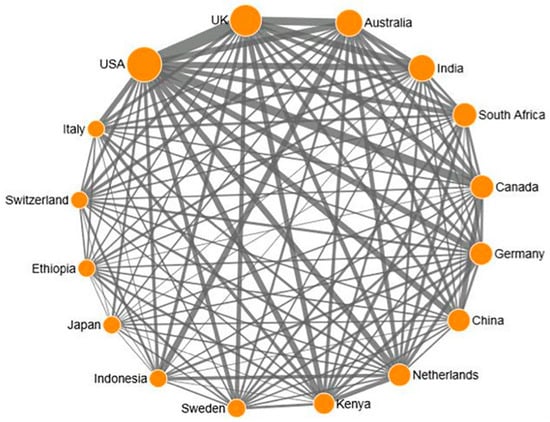 In the following, the terms ‘international co-publication’ or ‘international papers’ will be used to designate papers that have been published through the cooperation of authors from at least two different nations [70]. Figure 8 demonstrates the international cooperation links for 16 selected nations that are involved in SL research. Taking countries as the nodes within the network (the size of a node indicating the number of publications), lines between the nodes indicate collaboration between countries (the thickness of a line representing the amount of international co-publication). From a global perspective, it is notable that the major research communities have already formed a tight and integrated collaboration network, especially among the scientifically advanced countries. Countries may work collaboratively principally in their strong subject fields. Collaboration undoubtedly has a positive impact on published results [38,42]. American academic institutions and organizations are the main co-author partners in international co-authorship, and they have especially close working relationships with UK institutions/organizations in the field of SL. There are also strong and stable links between the UK and Australia, and between the USA and Canada.