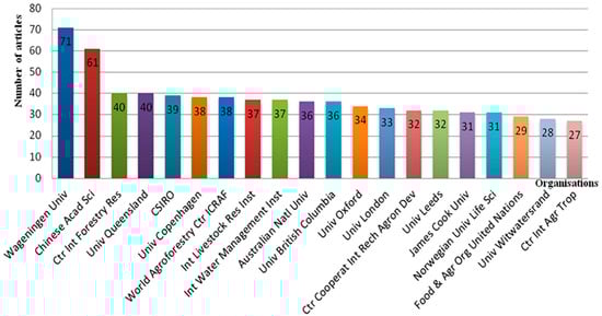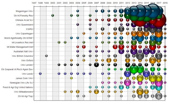 The aim of the institutional-contribution analysis is to distinctly depict the participation level of institutions/organizations in the SL field. Figure 9 reveals that Wageningen University in The Netherlands, with 71 papers, was first in its publication output, followed by the Chinese Academy of Science (61 papers), then the Center for International Forestry Research (CIFOR) in Indonesia and the University of Queensland in Australia, with 40 papers each. The differences in output among institutions ranked 3rd through 20th are relatively small. As Figure 8 and Figure 9 make clear, SL research has attracted the attention of researchers from around the world. Figure 10 clearly shows the temporal distribution of papers from the top 20 most productive organizations since 1998. In that year (1998), there was just one SL paper from among the top 20 institutions. It came from the University of Leeds and was on the issue of household livelihood strategies.