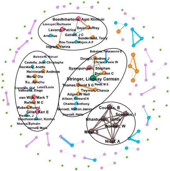 To gain a better understanding of the dynamics of co-authorship networks, the paper looked at the principal subjects addressed by the four cooperation sub-network shown in Figure 12. These are livelihood diversification as one of the significant ways for marginalized communal farmers to adapt to changes [74]; how charcoal production and trade influence rural areas [75]; and SL issues in southern Africa [49,89,90,91].