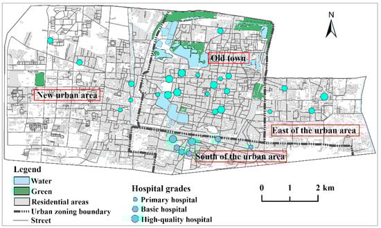 The old town, the new western urban area, the eastern urban area, and the southern urban area were selected for study because they (a) are the main loci of social and economic activity in the city (Figure 1), (b) house a large proportion of the urban population, and (c) have the most complex and congested traffic conditions. The integration of Zhengzhou and Kaifeng and the promotion of urban agglomeration in the Central Plains have led urban construction in Kaifeng to expand outward considerably in recent years. At present, the new urban area has become an important focus of urban development and expansion. The rapid expansion of cities has led to urban traffic congestion and uneven distribution of public service resources, which will not only affect accessibility to hospital care and social equity but also bring great challenges to future urban development [13,14,15,53].