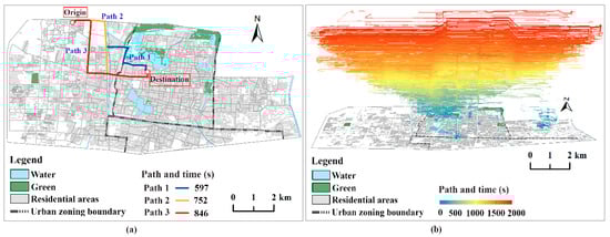 Navigation path and time consumption. (a) An example: navigation path and time; (b) Optimal navigation path and time for residential area self-driving transport to hospital during off-peak travel times.