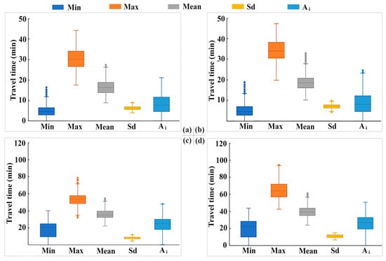 Box-plots for the baseline travel time. (a) Off-peak periods self-driving transport; (b) Peak periods self-driving transport; (c) Off-peak periods public transport; (d) Peak periods public transport. Box boundaries are the 25 and 75 percentiles, and the circle indicates each outlier.