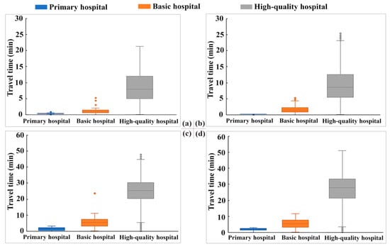 Under the optimal weighted accessibility model, travel time data are lower than the average value, and the data distribution is the most stable. At the same time, the time fluctuation in different travel modes and time periods is also the smallest. In past studies, the level of hospital technology at a hospital facility is a major concern for residents when making choices regarding hospital treatment [26,46]. Therefore, the weighted travel time is closer to the actual situation of residents. We use this model as the final evaluation of accessibility. First, the travel time from each residential area to different hospital levels is counted (Figure 4).