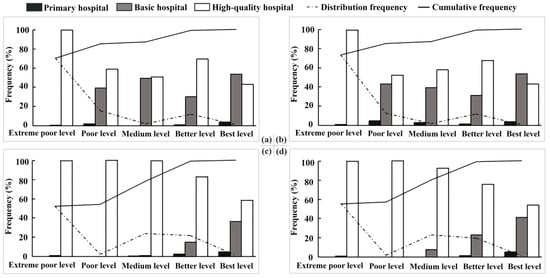 The accessibility (Ai) values via public transport and self-driving transport can be divided into five grades by applying GIS (geometric interval classification) (based on the non-peak value) to the accessibility results calculated by Equation (1) (Table 1). The distribution frequency and cumulative frequency of the number of the residential units by level of accessibility and the proportion of each hospital grade at that level were calculated for both peak and off-peak periods and for the two transport modes (Figure 5).