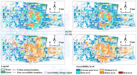 To analyze the internal differences and overall spatial distribution of hospital accessibility in each residential area, visualizations were created of the spatial distribution of the accessibility levels. These are presented in Figure 6, in which regions with major accessibility changes at different times are indicated with a red ellipse. Regions with poor accessibility under all conditions are divided off with black lines.