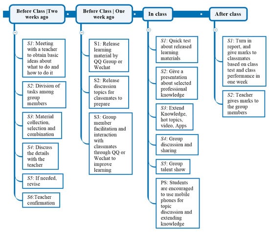 A flipped classroom is an instructional strategy and a type of blended learning that reverses the traditional learning environment by delivering instructional content, often online, outside of the classroom. It moves activities, including those that may have traditionally been considered homework, into the classroom. The flipped classroom is still primarily a student-centered and active pedagogical method [27]. In the flipped classroom, a significant portion of the class time is used for practice, application exercises, group discussion, and extending knowledge to improve students’ deep learning, knowledge, understanding, and generative processes. In recent years, the flipped classroom method has been applied in many disciplines and different grades of teaching practice, such as medical classrooms, language learning, and natural science. Several researchers and educators [28,29,30] have adopted flipped classroom methods in their research or classrooms, and found that students have positive experiences or advantages in STEM disciplines [31].