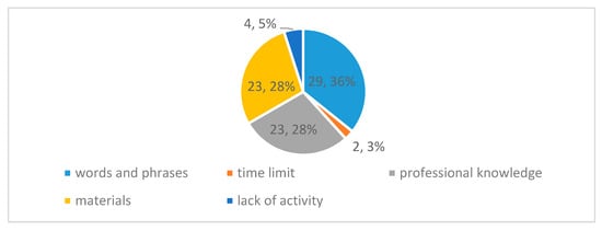 As shown in Table 7 and Figure 2, all of the difficulties reported by students occurred in the “before class” phase. The difficulty faced by the largest number of students was with words and phrases, reported by 29 students (36%). Even though every student had an English–Chinese dictionary, it remained an unexpectedly significant obstacle to effective study. The second and third difficulties were related to the learning materials delivered before class: 23 students reported difficulties with the abstract and professional computer knowledge, and 23 students reported that the learning materials were too complex and the key points were obscure. Additionally, four students reported a lack of learning enthusiasm and self-management, and difficulty focusing on studying without supervision. All of the reported difficulties provide some clues for future modification and expose the problems of Chinese students.