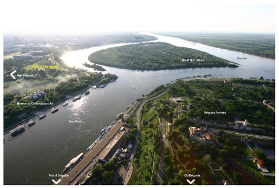 The 2003 General Plan further developed aspects of preservation and enrichment of the natural structures surrounding the confluence, including Kalemegdan park in old Belgrade, Park of Friendship, the continuous strip of green along Sava’s left bank, as well as the Čaplja Island and area on the left bank of the Danube []. The plan thus included the formation of green riverbanks entitled “Natural Core of Belgrade”, with the Great War Island at its centre [,].