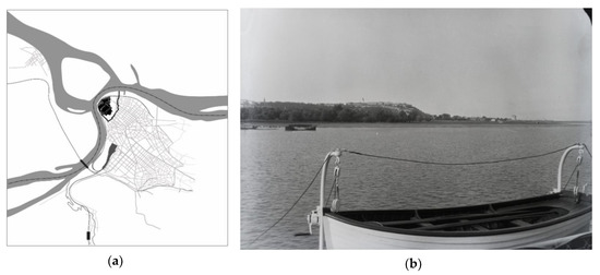 (a) A map/diagram of Belgrade in 1918 (design by Slobodan Radosavljević); (b) The Danube opposite the Belgrade Fortress: the view from the Zsófia Herczegnő luxury steamer. Photo from 1916. Source: http://www.fortepan.hu/_photo/display/132360.jpg; image 23/170; image ID: 132360. Original: Magyar Műszaki És Közlekedési Múzeum/Archívum/Negatívtár/Özv Venczel Jánosné Gyűjteménye; inventory reference: MMKM TFGY 2017.10.111.