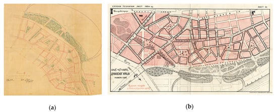 (a) Dimitrije T. Leko, Plan for the Danube neighbourhood, 1:2000, 1904. Source: [] (p. 398); (b) Superimposed plans for the Danube neighbourhood by Dimitrije T. Leko, and the changes made by the Sewage Department of the Municipality of Belgrade, 1:5000, 1904. Source: [] (p. 397).