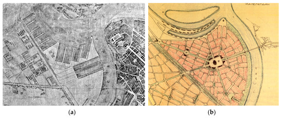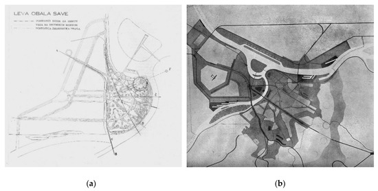 With the end of the First World War and the formation of the Kingdom of Yugoslavia, the Sava and Danube ceased to be the border. The broad wetlands on their left banks were perceived as an integral part of the city landscape. The first urban-planning step onto the left bank of the Sava was made in 1921–1922 with the international competition for the General Plan for the beautification and enlargement of Belgrade. The competition program envisioned the new main city port with accompanying facilities on the terrain between Belgrade and Zemun. Competition entrants followed the program instruction, but they also proposed the construction of new residential and industrial districts, such as the French authors whose project bore the motto Urbs Magna (Figure 4a). Furthermore, there were ideas for the formation of an artificial lake on the arm of Danube, construction of sport complexes, stadiums, and parks. Viennese authors, under the motto Singidunum Novissima (Singidunum was the Roman name of Belgrade), observed the wetlands on the left bank of the Sava as the dominant and most favourable space for the future expansion of the city []. In 1923, based on ideas from various competition entries, the first official draught plan for the future New Belgrade was formulated by George Pavlovich Kovalevsky, an engineer of Russian origin and a leading urban planner in interwar Belgrade. However, the draft did not become part of the adopted General Plan from 1923–1924, due to the fact that the territory on the left bank of the Sava did not fall under Belgrade administrative authority, but belonged to the municipality of Zemun.