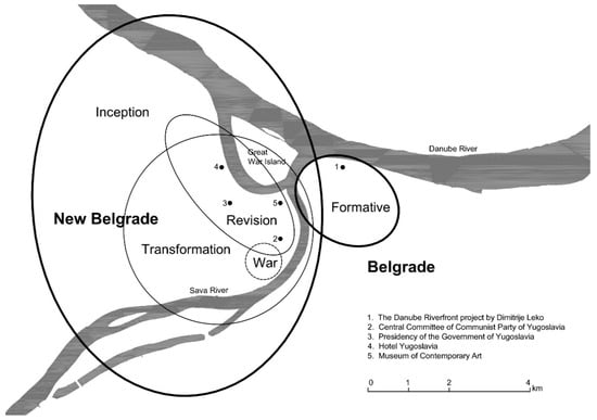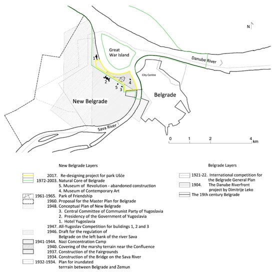 Facing a moment of profound change in Belgrade riverscape, our study is focused on the city’s central green core and the large open public space on the right bank of the Danube. Following Christophe Girot’s notion that “[e]ach time a landscape project begins there should follow an extended period in which one may simply discover what already exists” [] (p. 65), we have undertaken a historical survey in attempt to grasp both perceptible and ‘not so obvious’ layers of modernisation, inscribed into the peculiar site of the urban park Ušće (confluence in Serbian). Even though historical enquiry is considered a standard methodological procedure and supposedly forms a common part within the practice of landscape architecture and urban design, under pressure from time-saving and profit-based demands of the capitalist economy, this step is often neglected or severely reduced. Being aware of these reductions and their consequences, the survey starts from a general question: how to acquire profound knowledge and experience, as proper introduction to a site project? Knowing that the dominant paradigm of contemporary city development has already been framed for decades by the universal idea of sustainability [], we intend to explore ways to approach interventions in the modern city, and furthermore, how to relate to a modern city that was conceptualised and realised within a socialist society—to wit, the capital of former Yugoslavia.