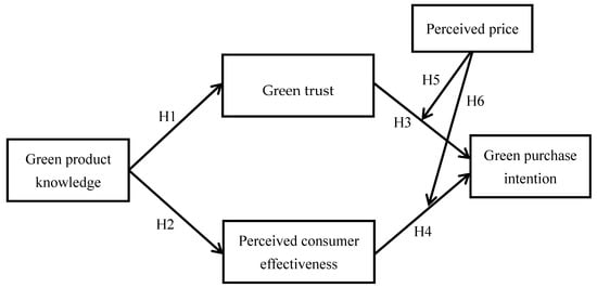 In order to gain a greater market share of green products, enterprises develop a variety of green products and services to meet consumer demand []. Marketers disseminate the environmental functional attributes, innovation, and characteristics of green products through multiple media, hoping to persuade consumers to try new green products. Various marketing methods are potential ways to disseminate green product knowledge to consumers. As a result, environmental awareness and health consciousness of consumers have been improved. Consumers gradually change their consumption concept and increase the purchase of green products []. Consumers improve their green product knowledge through purposeful learning and accidental learning strategies [,], and their knowledge level of green products has been gradually improved. More and more consumers participate in environmental protection activities. A study reports that 90% of American consumers are concerned about the environmental consequences of their purchases, and 75% of consumers would consider the environmental impact of products when making purchasing decisions []. However, the market share of green product is still low []. That is to say, most consumers have certain green product knowledge, but do not necessarily translate their knowledge into behavior. Green product knowledge plays a key role in consumers’ decision to purchase green products and is often considered as a direct prerequisite variable for green purchase intention [,]. However, some studies found that knowledge does not necessarily directly affect behavior [,]. There is a complex relationship between knowledge and behavior []. Therefore, a question remains as to whether there are other key variables involved in the relationship between green product knowledge and green purchase intention. Existing studies have shown that knowledge affects consumers’ decision-making processes. Consumers’ knowledge level and their attitude towards green products are directly related to consumers’ purchase intention. This study suggests that green trust and perceived consumer effectiveness can effectively explain the internal mechanism of green product knowledge transforming into green purchase intention. Perceived consumer effectiveness is defined as an individual’s belief that the efforts of their actions can make a difference in solving environmental problems []. In addition, the motivation of consumption depends on the consumption value, which is an important factor influencing consumers’ purchase intention []. Price is an expression of product value and is an important factor affecting consumers’ purchase behavior. Therefore, perceived price is introduced as a moderating variable in this study.