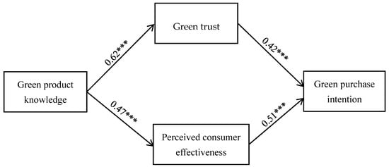The results show that green trust partially mediates the relationship between green product knowledge and green purchase intention, which indicates that green trust helps to transform green product knowledge into green purchase intention. Consumers more knowledgeable about green products have more confidence regarding the environmental protection attributes and effects of green products. This fact increases consumer trust in green products, as well as the possibility of purchase. In addition, perceived consumer effectiveness mediates the relationship between green product knowledge and green purchase intention. This shows that when purchasing green products, the more knowledge consumers have about green products, the more they believe that using green products can produce positive results for the environment. Consumers who form a strong belief in the positive results are more likely to believe that personal green purchasing behavior can improve the environment and reduce environmental pollution. The possible reason for this result is that China is a country with collectivist culture. Consumers tend to have altruistic values, and consider the welfare of society or others. Consumers with altruistic values not only pay more attention to environmental problems, but also believe that environmental problems can be alleviated or solved through their own environmental behavior []. This also confirms previous studies that collectivist cultural orientation can promote perceived consumer effectiveness []. Most previous studies did not examine the antecedent variables of perceived consumer effectiveness [,]. However, this study finds that green product knowledge can be used as an antecedent variable to perceived consumer effectiveness. This provides a new possibility for promoting perceived consumer effectiveness.