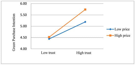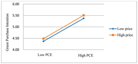 In this study, all variables are continuous. This study uses hierarchical regression modeling to examine moderating effect by SPSS 18. The regression equation consists of three hierarchical steps. We use mean center to deal with all variables to unify the units. The hierarchical regression was used with the control variables entered as a block in step 1 (gender, age, education level, and income), followed by the main effects in step 2 (green product knowledge, green trust, and perceived consumer effectiveness), and the interaction item in step 3 (green trust × perceived price; perceived consumer effectiveness × perceived price). We followed Aiken and West’s [] procedures and plotted the interaction relationship under high (one SD above the mean) and low (one SD below the mean) levels. Firstly, the moderating effect of perceived price on the relationship between green trust and green purchase intention was analyzed. As shown in Figure 3, perceived price moderates the relationship between green trust and green purchase intention (β = 0.117, t = 2.473, p < 0.05). Compared with low perceived price, green trust has a greater impact on green purchase intention under high perceived price, so it is assumed that H5 is supported. After that, we analyzed the moderating effect of perceived price on the relationship between perceived consumer effectiveness and green purchase intention. As shown in Figure 4, perceived price has no moderating effect on the relationship between perceived consumer effectiveness and green purchase intention (β = 0.055, t = 1.244, p > 0.05). In the case of high and low perceived price, there is no significant difference in the impact of green trust on green purchase intention. Therefore, H6 is not supported.