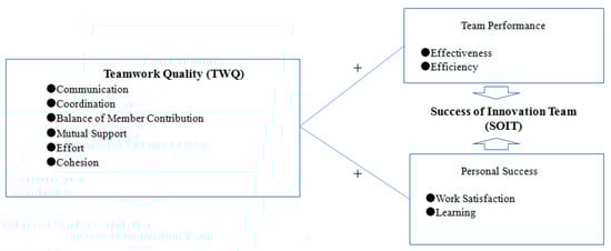The theoretical model of teamwork quality (TWQ) is often used to study the relationship between teamwork factors and team performance, team members’ personal success, team success and sustainability, including the research and evaluation of a research and development (R&D) team in enterprises [8,12,13,14,15,16], medical care teams [18,19], learning groups in education [20], and agile team research in software development [21,22]. However, although previous studies have used the TWQ model to explain the relationship between teamwork and different teams, few studies have examined high-level research and innovation teams, especially those working in the frontier areas of basic research and in innovative groups funded by government funds. At the same time, in the relevant literature, many studies have examined scientific research organizations and teamwork [22,23,24,25,26], but few have used the TWQ model to analyze the impact of team structure and teamwork on a team’s success and sustainability.