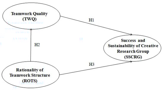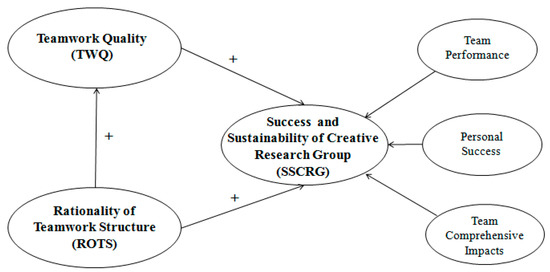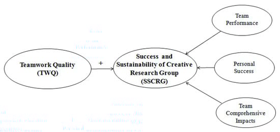 Many studies have demonstrated the impacts of TWQ on team performance, project success, team success and sustainability [8,12,13,14,15,16,17]. What are the specific contents that affect TWQ, and what is its specific and extended theoretical model of TWQ when predicting the success and sustainability of the Creative Research Group (SSCRG)? Based on previous studies and the current state of the CRG, we propose the theoretical model of the extended version of teamwork quality, which takes TWQ, the rationality of team structure (ROTS), and SSCRG as its main constructs and impact factors.