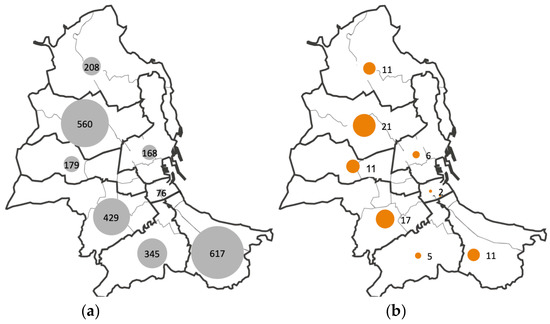 Public housing on sale (a) and public housing sold (b) per district in Palermo (Italy) from January 2016 to May 2018.